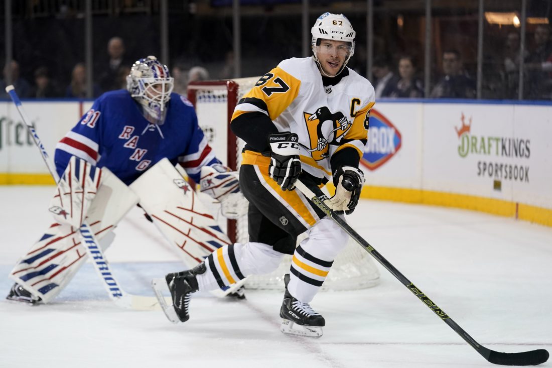 AP Photo Pittsburgh Penguins center Sidney Crosby (87) chases the puck after taking a shot on goal against New York Rangers goaltender Igor Shesterkin (31) during the first period Friday in New York.