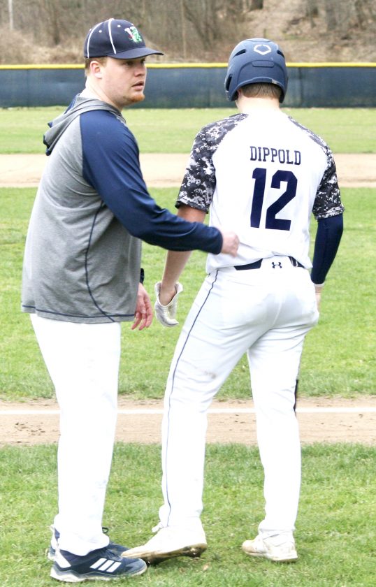 Warren head coach Andrew Morrison talks with third-place hitter Eric Dippold while General McLane has a mound visit in the Dragons’ 7-3 region win. Times Observer Photo by Jon Sitler