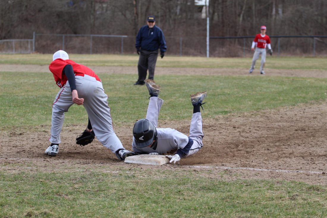- Times Observer Photo by Steve Younger Eisenhower’s Shawn Pascuzzi dives safely back into first base during Monday’s Region 3 game against Youngsville in Russell.