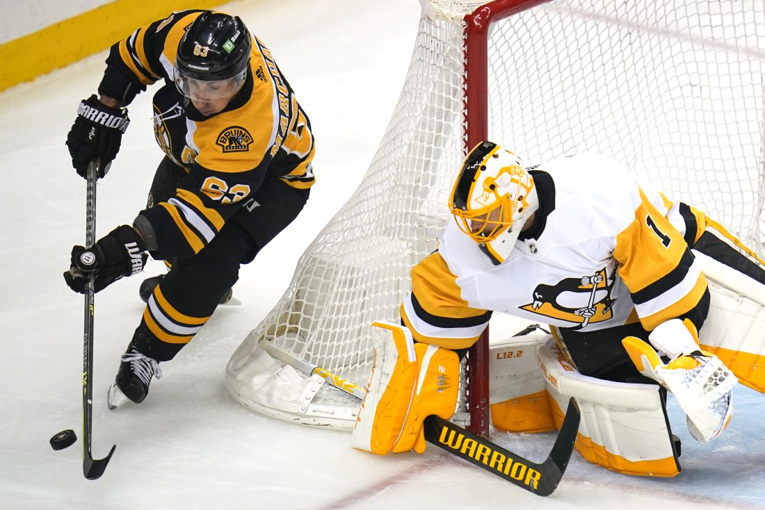 AP Photo Boston Bruins’ Brad Marchand (63) can’t get a wraparound past Pittsburgh Penguins goaltender Casey DeSmith during the first period in Pittsburgh on Thursday.