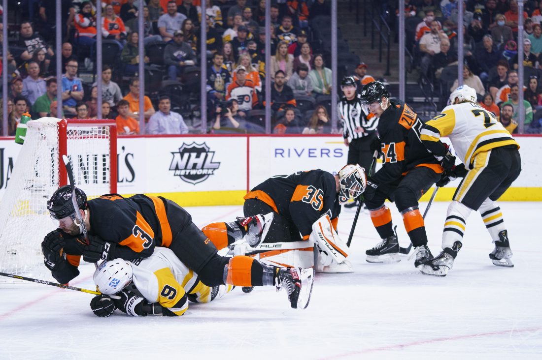 AP Photo Philadelphia Flyers’ Martin Jones, center, covers up the puck as his defense keeps Pittsburgh Penguins players away during the first period Sunday in Philadelphia.