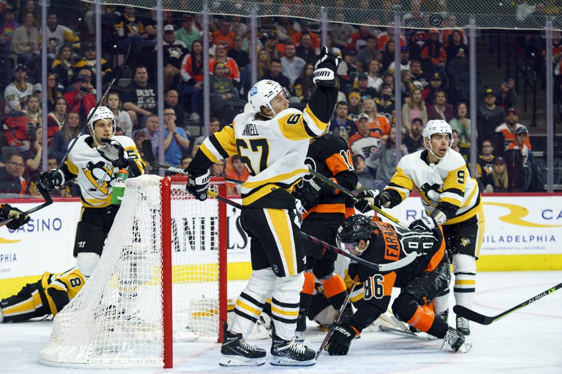 AP Photo Pittsburgh Penguins’ Rickard Rakell, center, reaches up for the puck during the second period against the Philadelphia Flyers on Sunday in Philadelphia.