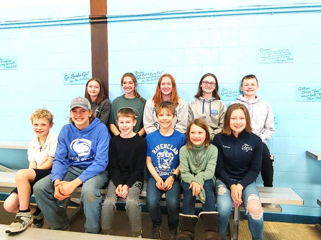 Pictured is the 2021-22 YMCA Dolphins. From left, in the front row, are Hayden Myers, Drake Niemetz, Kaden Werner, Levi Peterson, Clair Peterson and Emma Peterson. In the back row are Samantha Caudill, Kirstin Johnson, Sophie Olsen, Jennifer Giger and Landon Frederes. Missing from the photo are Zoe Chitester and Max Harrison. Photo submitted to the Times Observer