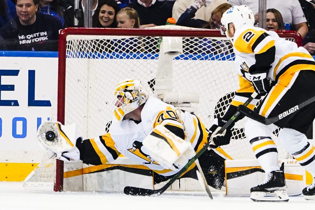 Pittsburgh Penguins goaltender Louis Domingue (70) stops a shot on goal during the first period of Game 2 of an NHL Stanley Cup first-round playoff series against the New York Rangers on Thursday in New York. AP Photo