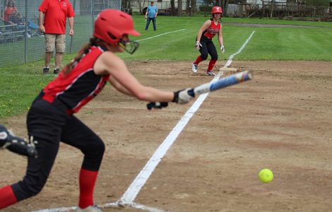Youngsville’s Kamden Swearingen lays down a perfect bunt to drive in teammate Alyssa Gentz from third base. Times Observer Photo by Steve Younger