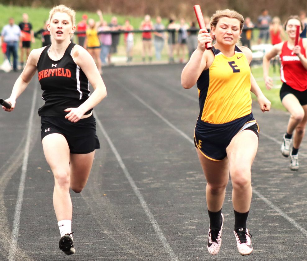 - Times Observer Photo by Cody Elms Sheffield’s Emily Foster, left, and Eisenhower’s Rayna Hultman finish strong in the 400-meter relay in a track and field meet Thursday at Sheffield High School.