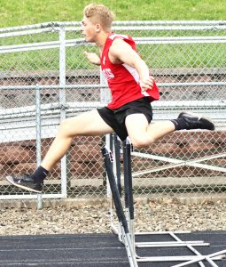 Times Observer Photo by Cody Elms Youngsville’s Koby Hendrickson shows his winning form in the 110-meter hurdles.