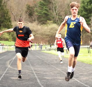 - Times Observer Photo by Cody Elms Eisenhower’s Mikael Beaver, right, finishes ahead of Sheffield’s Lucas McNeal during the boys 400-meter relay on Thursday.