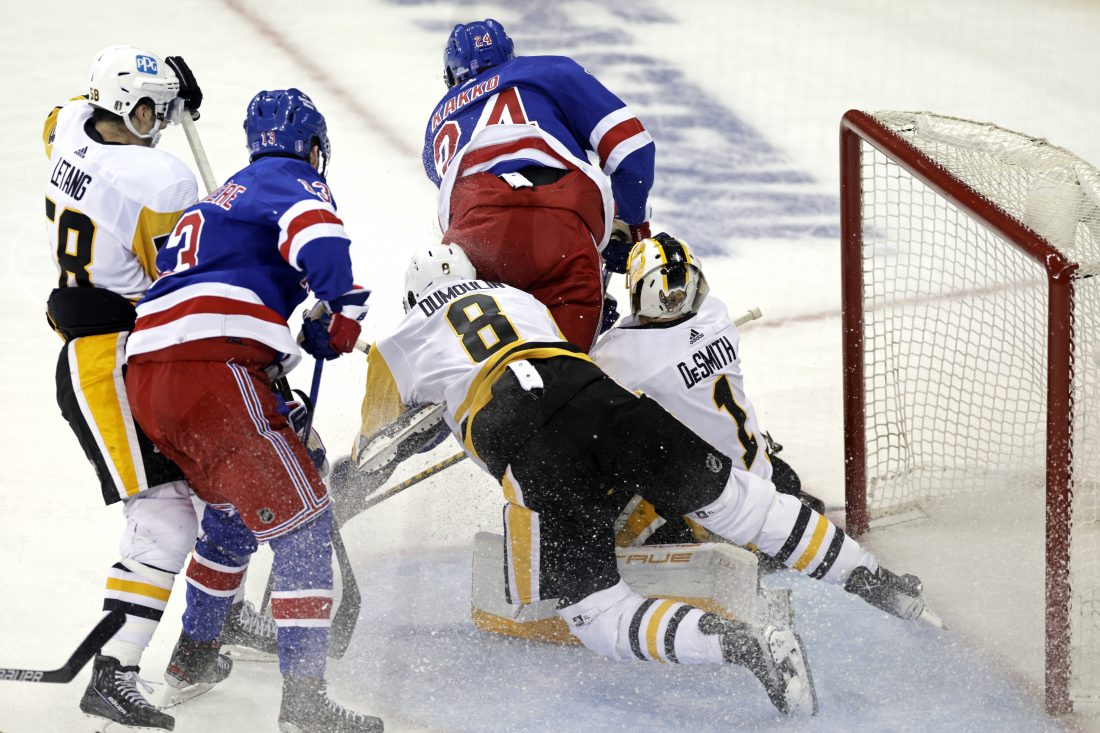 Filip Chytil nearly gave the Rangers a 4-3 lead with 3:10 left. Kaapo Kakko drove to the net, and he and Penguins defenseman Brian Dumoulin bumped into DeSmith. While falling to the ice, Kakko swept the puck back in front and Chytil put it in. However, the Penguins challenged and the goal was disallowed for goalie interference after a video review.