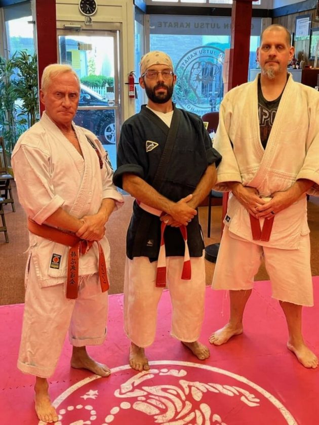 Matthew Jenkins, center, was recently promoted to 8th Degree Black Belt at Johnson’s Black Belt Academy in Warren. Jenkins is pictured with Rick Johnson, 9th Degree Black Belt, and Joe Tremblay, 8th Degree Black Belt.