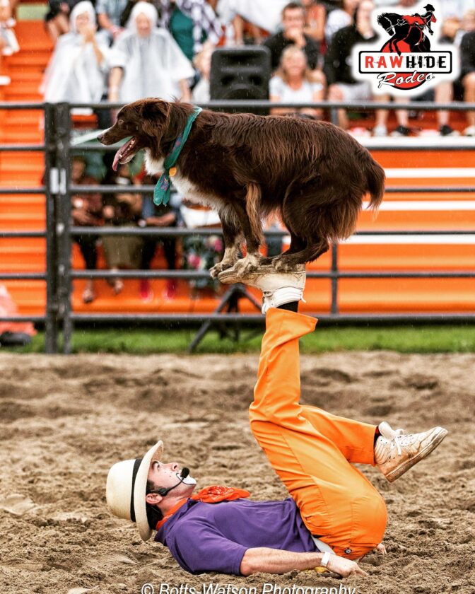 Submitted Photo Rodeo clown Brinson James and his trick dog “Reride” will be entertaining the fans Aug. 3-6 at the 77th annual Gerry Rodeo.