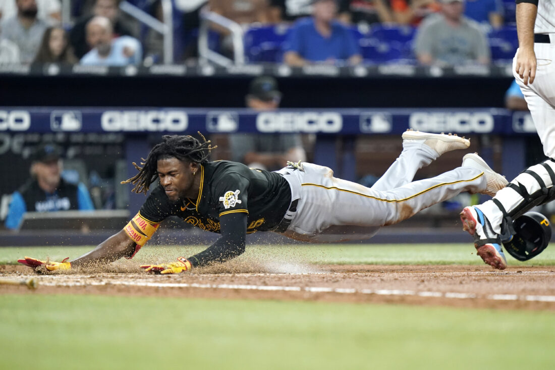 Pittsburgh Pirates’ Oneil Cruz scores on a Ben Gamel single during the fifth inning against the Miami Marlins on Wednesday in Miami. AP Photo