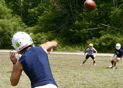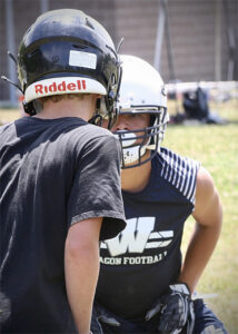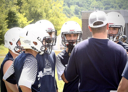 Assistant coach Cody Bupp huddles up with Warren players on Saturday during the second annual Warren Junior Varsity Summer Tournament at Warren Area High School. Hollidaysburg, coached by Homer DeLattre, finished 7-0 to win the six-team passing tournament. The Tigers defeated last year’s champions, St. Marys (5-2 record), in the finals. Warren’s varsity will participate this weekend in the Corry 7-on-7/Lineman Challenge.