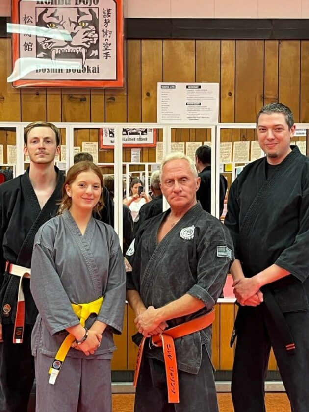 Lizzy Hollis was recently promoted to Yellow Belt after a one-hour test of her skills and knowledge at Johnson’s Black Belt Academy in Warren. Pictured, in front, from left, are: Hollis and Hanshi Rick Johnson, chief instructor. In back are: Kyoshi Kyle Corbin and Sensei Bruce Tuller.