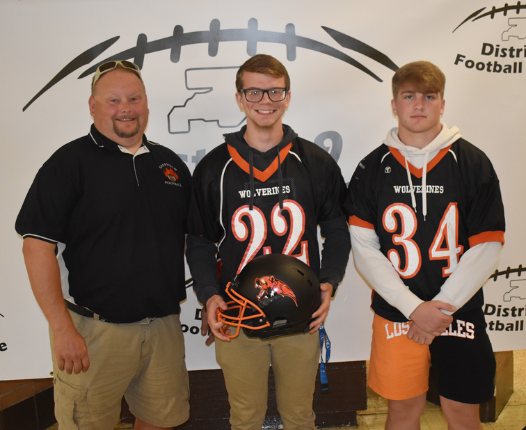 Sheffield head coach Mike Barr, left, is pictured with Wolverines’ seniors Gage Mott-Macalush (22) and Matt Lobdell at the District 9 Football League media day at St. Marys Area High School on Tuesday. Times Observer Photo by Scott Kindberg