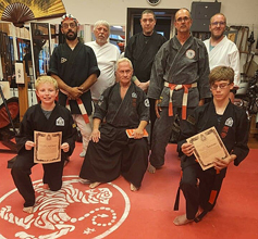 Several people received black belt promotions at Johnson’s Black Belt Academy this month. In the back row, from the left, are Kyoshi Jenkins, Kyoshi Williams, Sensei Tuller, Kyoshi Anderson and Sensei Krantz (testing board). In the front row are newly promoted Connor Schwanebauer to Sensei first-degree black belt; Hanshi Rick Johnson, chief instructor; and Sensei CJ Mix promoted to Tashi third-degree black belt. Both endured a four-hour testing of martial arts skills and knowledge.