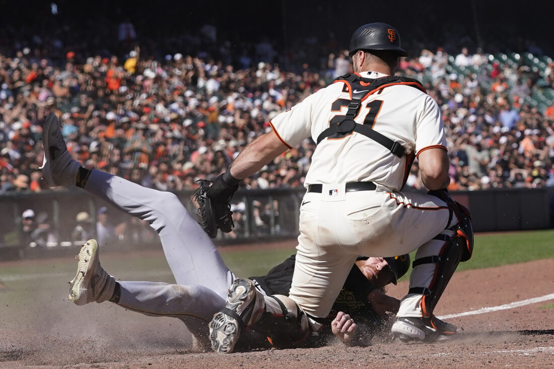 Pittsburgh Pirates’ Ben Gamel, bottom, is tagged out at home by San Francisco Giants catcher Joey Bart during the ninth inning of Sunday’s game in San Francisco. AP Photo