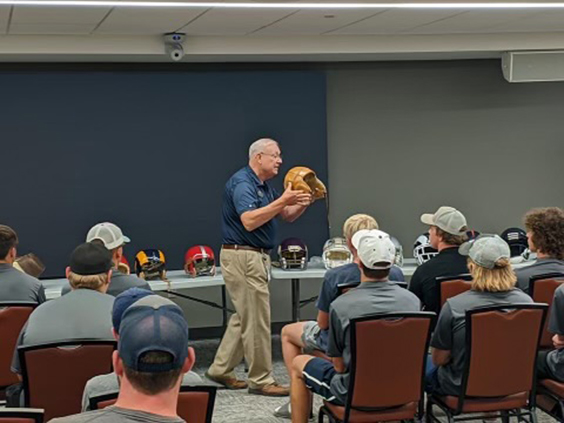 - Times Observer Photo by Steve Younger The players listen to a specialist talk about the evolution of the football helmet.