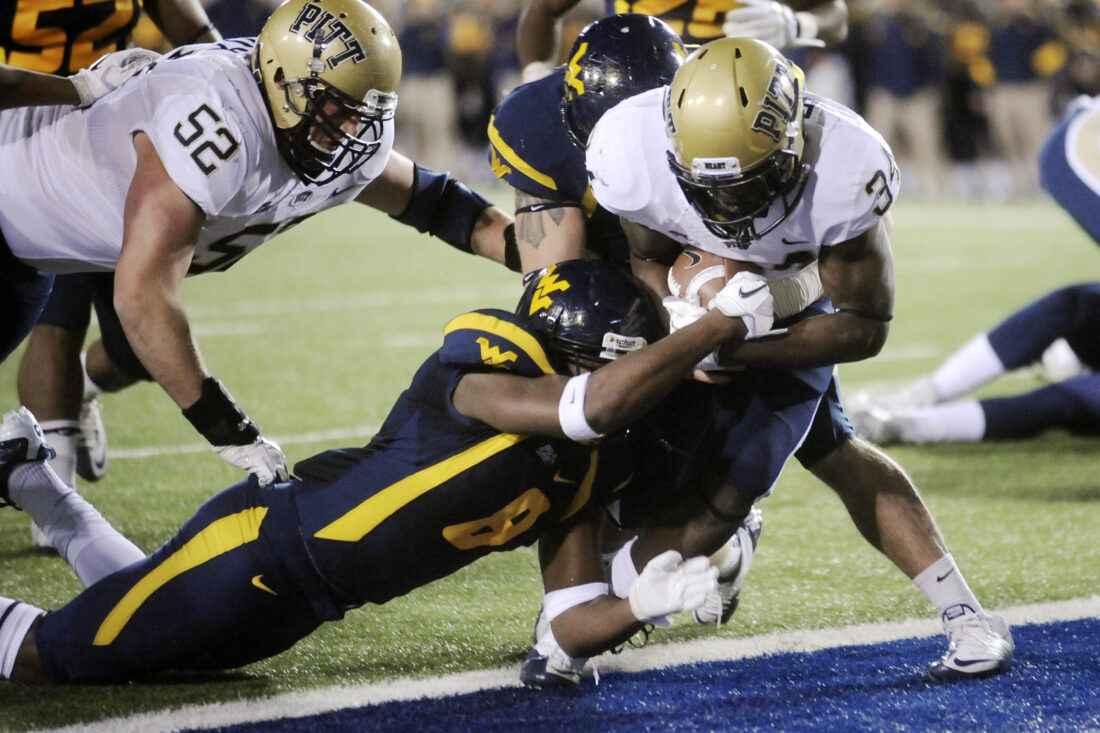 AP File Photo Pittsburgh’s Issac Bennett leans into the end zone past West Virginia’s Keith Tandy during the first quarter of a game Nov. 25, 2011, in Morgantown, W.Va. The rivalry between the longtime rivals will be renewed following an 11-year hiatus Thursday when the 17th-ranked Panthers host the Mountaineers.