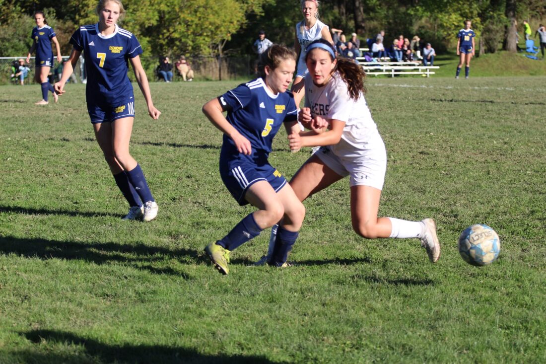 Eisenhower’s Elley Eastman, left, battles for the ball in Thursday’s Region 3 matchup against Mercyhurst Prep. Times Observer Photo by Steve Younger