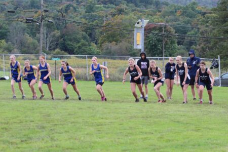 Runners leave the starting line during the varsity girls race as Eisenhower takes on Warren in cross country in Russell on Wednesday. Times Observer Photo by Steve Younger