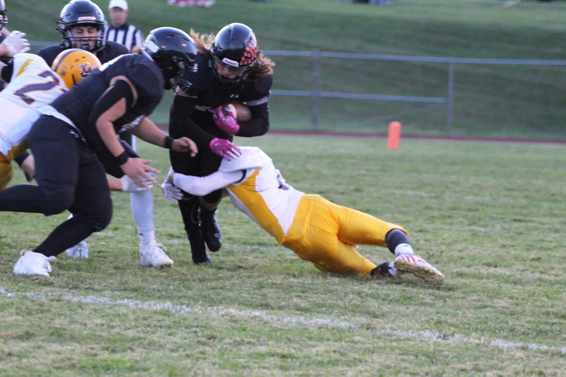 Eisenhower’s Garrett Jensen makes a tackle in the Knights 35-13 victory over the Sailors in Stoneboro on Friday. Times Observer photo by Steve Younger