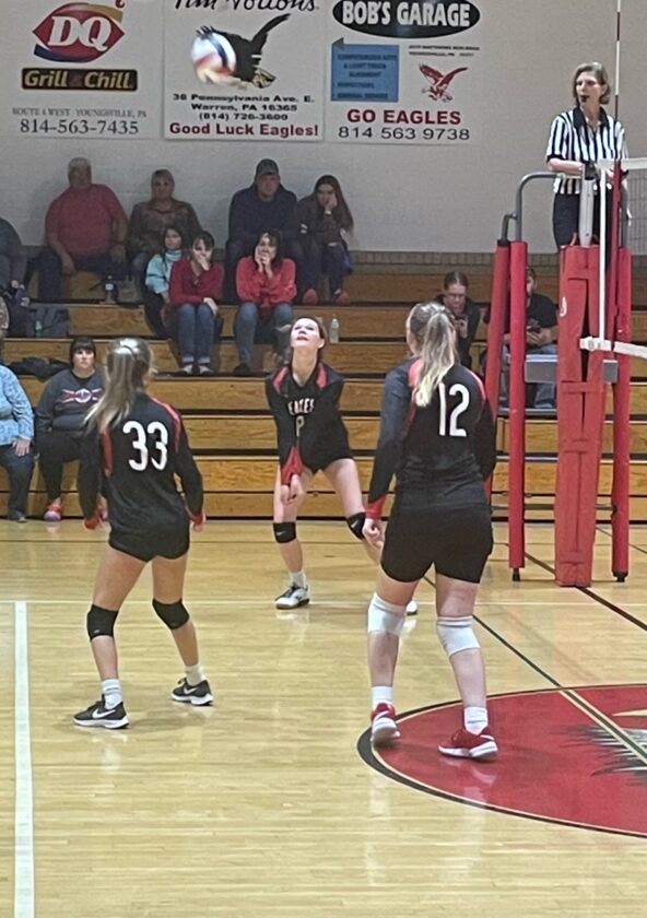 Youngsville’s Kamden Swearingen sets the ball for teammates Olivia Darling (12) and Madi Johnson (33) during Monday’s Region 2 volleyball match with Sheffield at Youngsville High School. Times Observer Photo by Allen Seybert