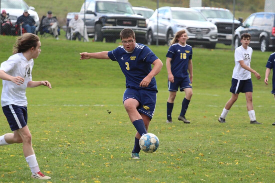 Times Observer Photo by Steve Younger Eisenhower midfielder Caleb McMillen passes to a teammate during the Knights’ soccer game against Conneaut, Ohio.