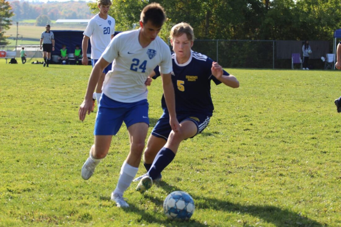 Eisenhower’s Bryston Wilkins, right, chases down a Seneca player during Monday’s boys soccer game. The Knights kept the game close at halftime, trailing 2-0, but the Bobcats, who are in first place in the District 10 Region 4 standings, wore down the hosts in the second half en route to a 6-0 victory. Eisenhower will be back in action with a pair of home games on Wednesday and Thursday at 4 p.m.