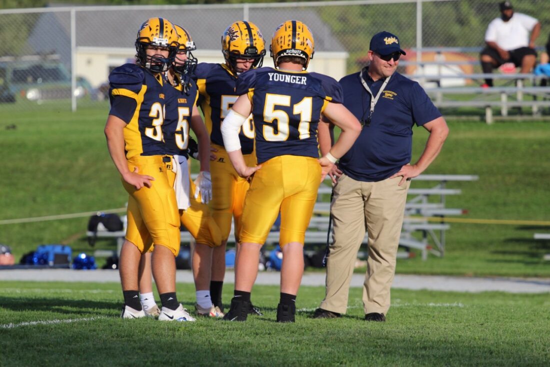 Eisenhower head coach Jim Penley speaks to his captains prior to a game. Times Observer Photo by Steve Younger