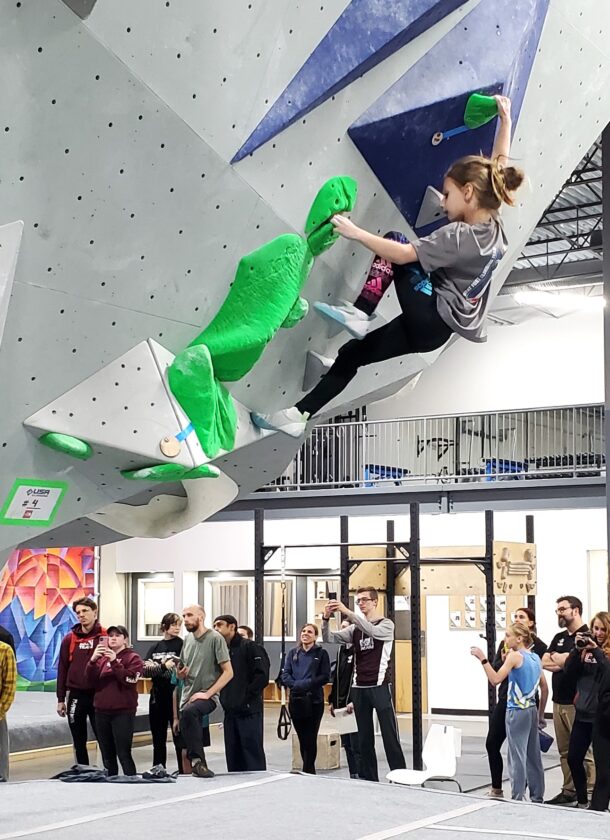 - Audrey Gillies of the Goat Fort Thundering Herd scales the wall at Iron City Boulders on Saturday. Photo submitted to Times Observer