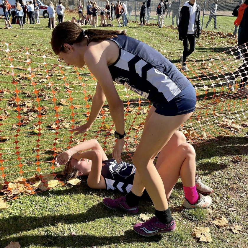 Warren senior Shyann Rulander helps up freshman teammate Morgan Alexander after both earned medals at this fall’s District 10 2A championships. Photo submitted to the Times Observer