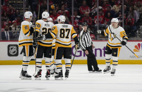 Members of the Pittsburgh Penguins celebrate a goal by Jeff Petry (26) in the second period of Wednesday’s game against the Washington Capitals in Washington. AP Photo