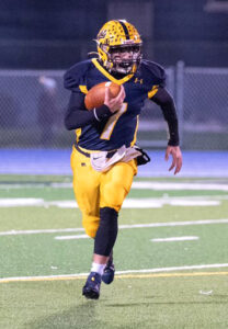 Times Observer Photo by Steve Younger Eisenhower quarterback Shawn Pascuzzi looks for room to run against Cambridge Springs on Saturday at War Memorial Field in Warren.
