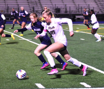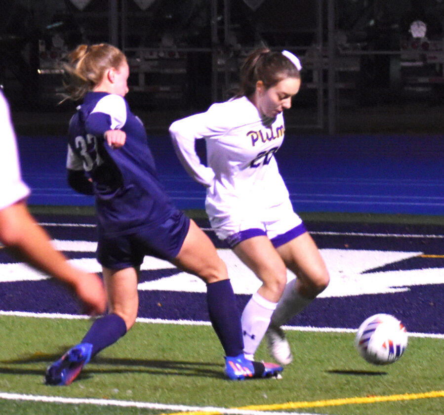 - Warren defender Lily Stanley races down the left wing with Plum’s Kaitlyn Killinger during the first round of the Pennsylvania Interscholastic Athletic Association 3A state championships on Tuesday at War Memorial Field in Warren. Times Observer Photo by Christian Storms