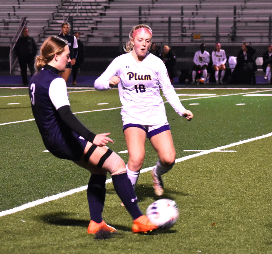 Warren defender Lily Stanley races down the left wing with Plum’s Kaitlyn Killinger during the first round of the Pennsylvania Interscholastic Athletic Association 3A state championships on Tuesday at War Memorial Field in Warren. Times Observer Photo by Christian Storms