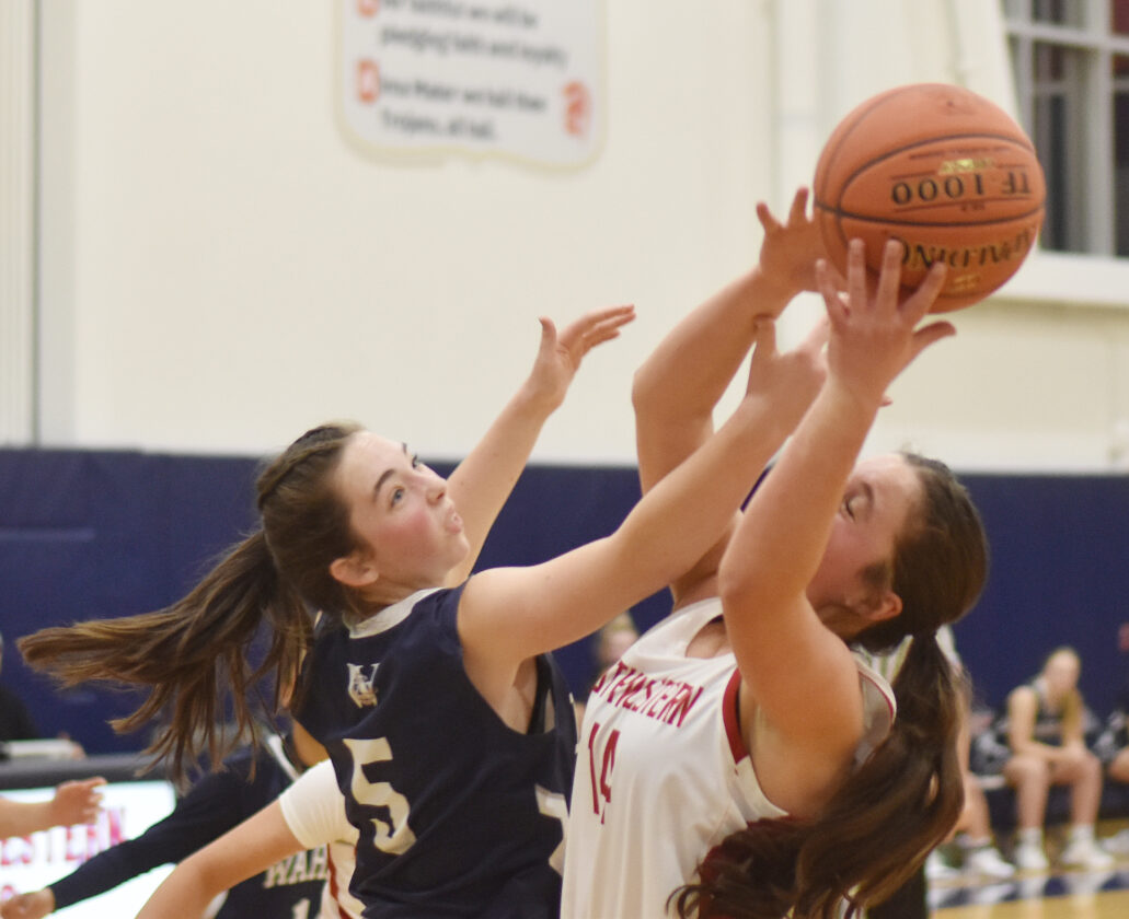 - Warren’s Alyssa Farr (5) and Southwestern’s Bella Sirianni battle for a rebound. Times Observer Photo by Scott Kindberg
