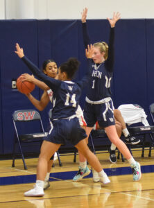 Times Observer photo by Scott Kindberg Warren’s Meea Irwin, right, defends Jamestown’s Alyson Canfield during the consolation game of the Southwestern Tournament on Saturday.