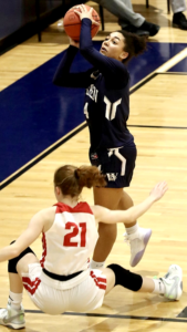 Photo by Mark Evans Warren’s Peyton Wotorson goes up for two over Punxsutawney’s Riley Doverspike on Saturday in the Dragons’ 63-45 loss at Warren Area High School.