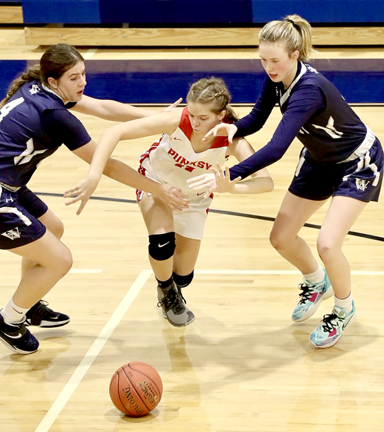 - Photo by Mark Evans Punxsutawney’s Samantha Griebel attempts to dribble through Warren’s Halle Kuzminski, left, and Sammie Ruhlman in the Chucks’ 63-45 tip-off tournament championship win on Friday at Warren Area High School.