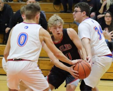 Youngsville’s Koby Hendrickson attempts to dribble through a pair of Kane defenders during Tuesday night’s 62-41 loss to the Wolves in the opening round of the Sheffield Holiday Tournament at Sheffield Area High School. Times Observer photo by Cody Elms