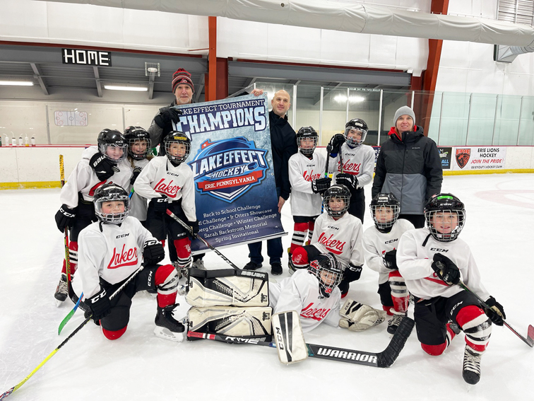 The Jamestown Lakers 8U White Division participated in the Lake Effect Hockey Iceberg Challange in Erie, PA this past weekend. This was the team’s first tournament of the season. They played through cold temperatures and a demanding schedule to bring home the championship gold medal in the 8U ‘A’ Division, going 4-0 in tournament play. Standing, from left to right, are Camron Briggs, Alexander Erickson, Ackron Hoisington, head coach Mark Chimera, assistant coach Nathan Hornstrom, Karmelo Benedetto, Jack Newman and assistant coach Tara Ristau. Kneeling, from left to right, are Grant Langworthy, Lucas Hornstrom, Samuel Chimera, Finn Ristau and Andrew Grosch.