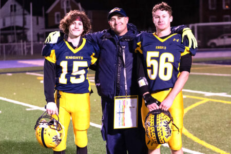 Flanked by sons Logan (15) and Caleb (56) Eisenhower football head coach Jim Penley celebrate his 100th career win earlier this fall. Times Observer Photo by Steve Younger