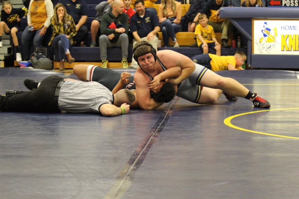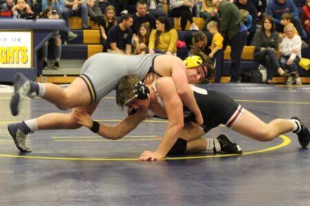 The Knights’ Benji Bauer took a forfeit at 189, and in the best match of the night, at 215 pounds, Eisenhower’s Brok English won a hard-fought decision over Matt Lobdell. With English leading 9-5, Lobdell got position on English with less than 20 seconds left, but English would not relent and fought off the near pin. Lobdell got three back points to make the final 9-8.