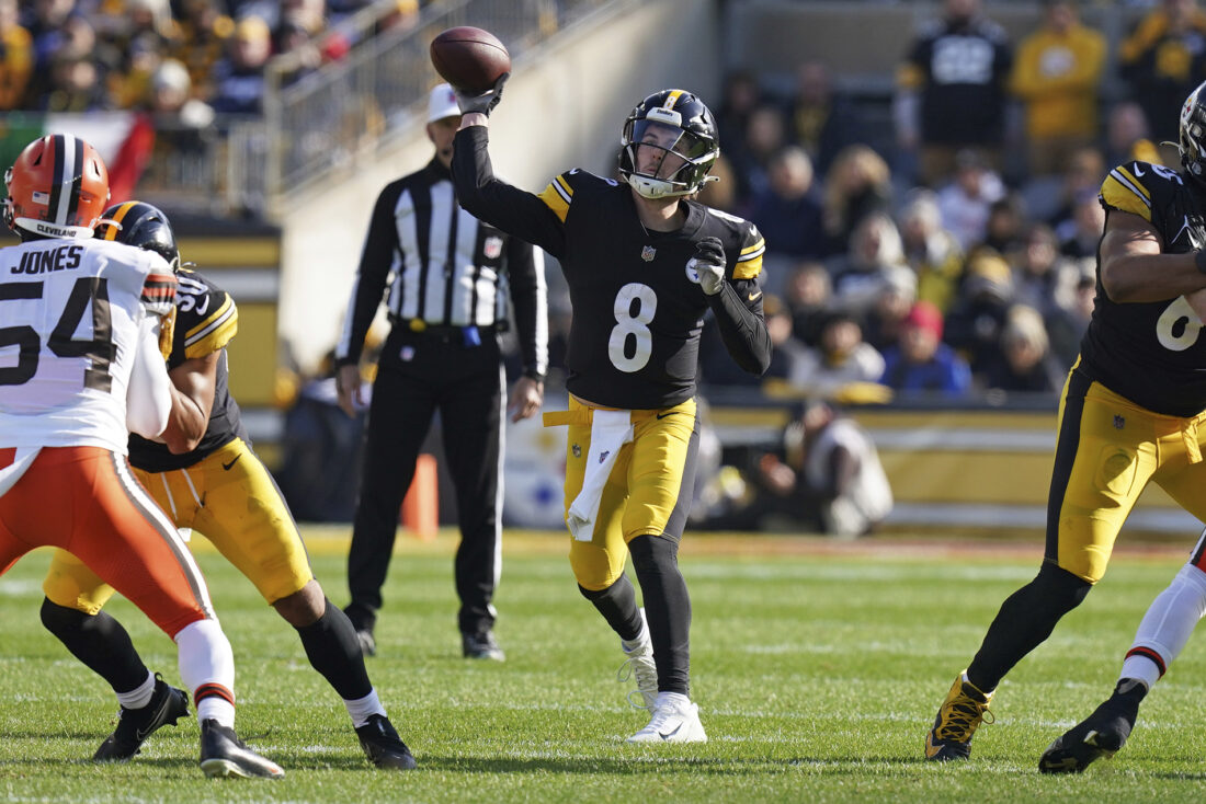AP Photo Pittsburgh Steelers quarterback Kenny Pickett (8) throws a pass during the first half against the Cleveland Browns in Pittsburgh on Sunday.