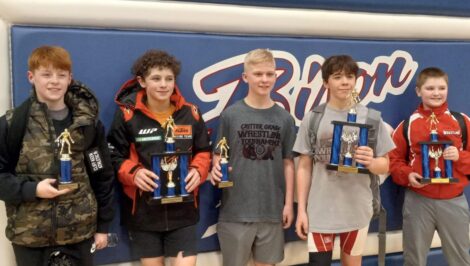 From left to right are, Ayden Dean in 4th Place, Youngsville youth wrestler Logan Johnson in 3rd Place, Youngsville youth wrestler Tucker Sanford in 4th Place, Mason Fleming in 3rd Place, Youngsville youth wrestler Johnathan Sullivan in 3rd Place.