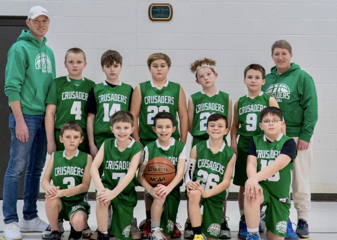 The St. Joseph Catholic School Crusaders had an undefeated regular season in the YMCA School Basketball League, third-and-fourth-grade division, including winning the end-of-season tournament. Team members, from left, in front, are Braylon Curtis, Theoden Goodwill, Liam Johnson, James Alexander and Kane Agee. In back row are coach Josh Caldwell, Ethan Zimmerman, Seth Gatto, Jack Abplanalp, Noah Caldwell, Reed Fitzgerald and coach Teresa Abplanalp.