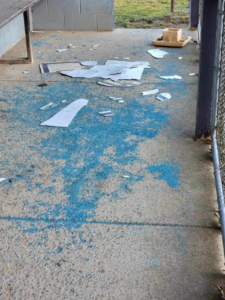 “The ties to the outfield fence and backstop screens were cut, grass seed was dumped all over the home dugout and spread all over the pitcher’s mound that we just completely redid,” said Morrison of Legion Field, the baseball field. “One of the benches from the dugout was taken and placed on the mound as well. The concession stand was damaged … as they clearly attempted to break in. The plastic surrounding the window is smashed and there are several marks on the window as they tried to break in, but were unable to do so. The light on the concession stand was smashed and the electric conduit was pulled out. We aren’t sure yet about the exact costs of damage. We are hopeful we got the grass seed off before it did any real damage, but the damage to the screens and consession stand is all permanent and will need fixed.”