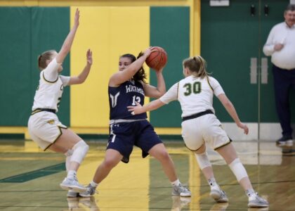 Photo courtesy of Mark Evans Warren sophomore Alana Stuart is guarded by Blackhawk’s Haley Romigh (25) and Piper Romigh (30) in Blackhawk’s 51-32 PIAA Class 4A playoff win over the Dragons on Saturday at Blackhawk High School.