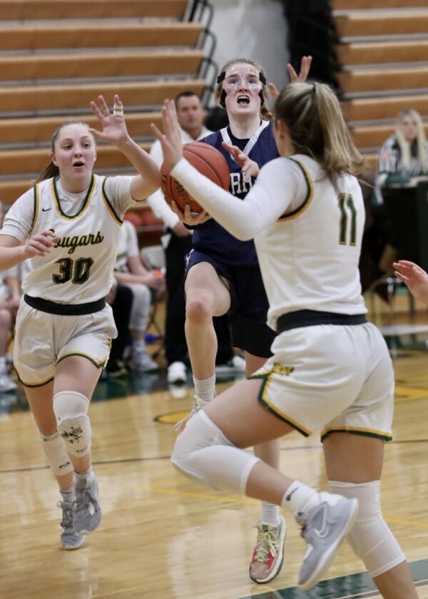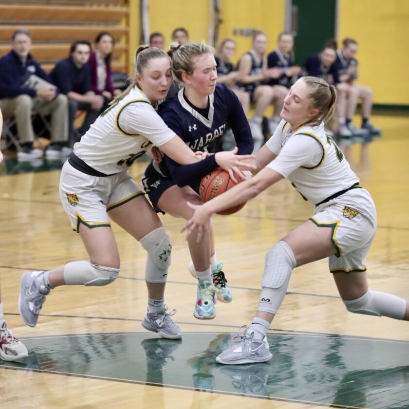 Photo courtesy of Mark Evans Warren’s Sammie Ruhlman is defended by Blackhawk’s Piper Romigh (30) and Haley Romigh (25).